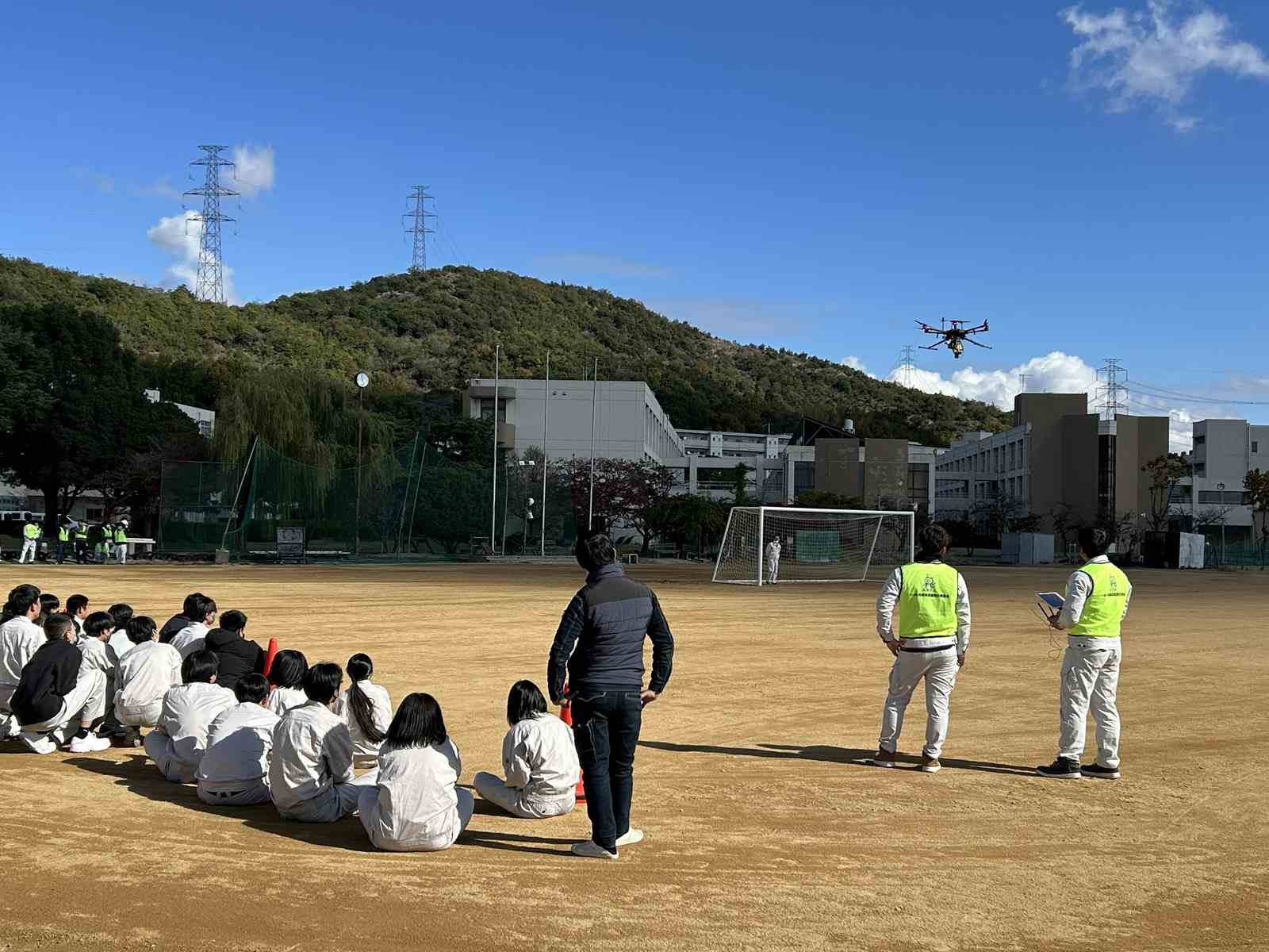 最初に「測量の過去から現在」と題した講義において、測量の基礎を学んでいただき、屋外では測量機器を操作していただく実習を行った後に、ドローンの飛行を見学していただきました。