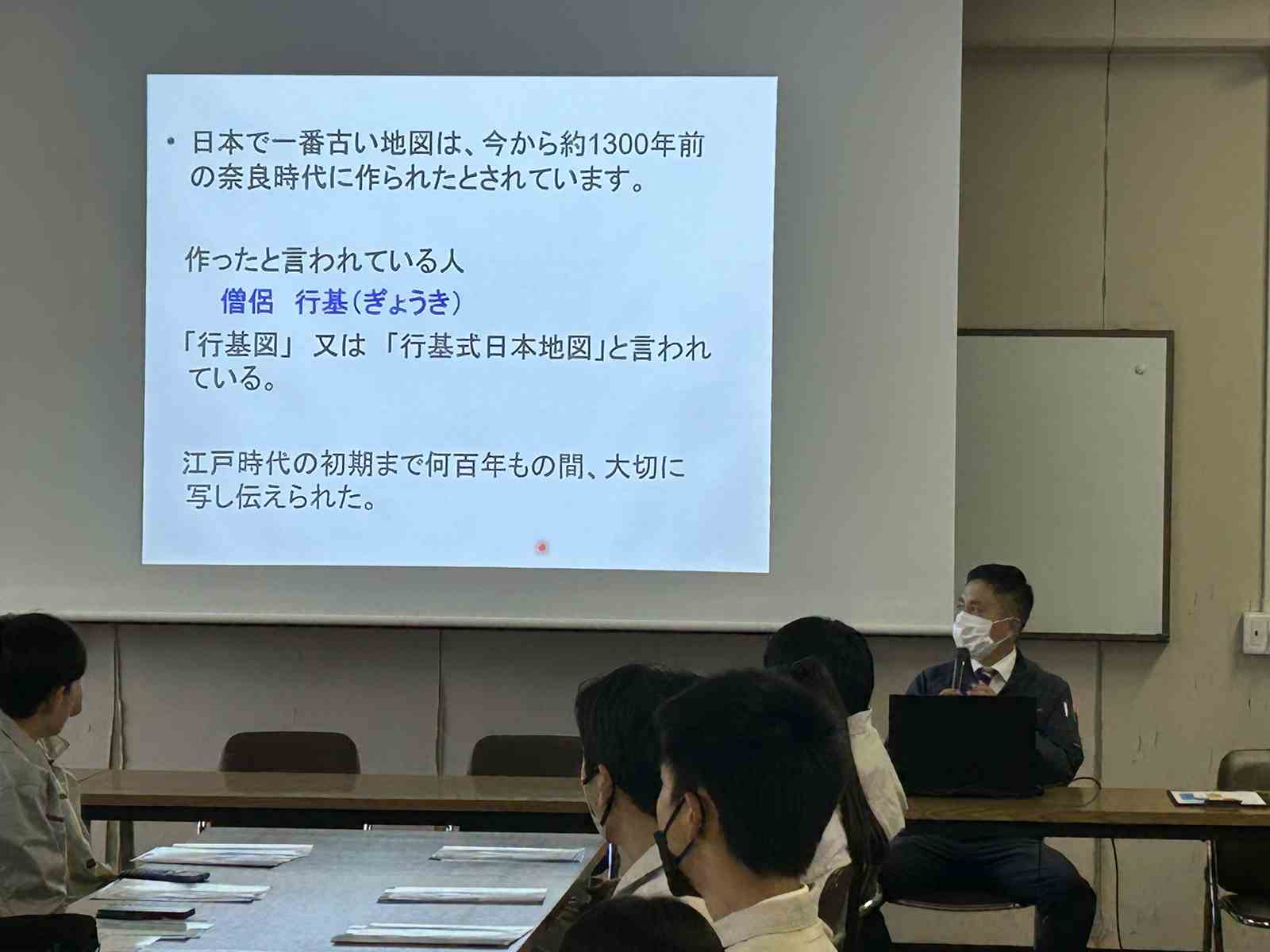 最初に「測量の過去から現在」と題した講義において、測量の基礎を学んでいただき、屋外では測量機器を操作していただく実習を行った後に、ドローンの飛行を見学していただきました。